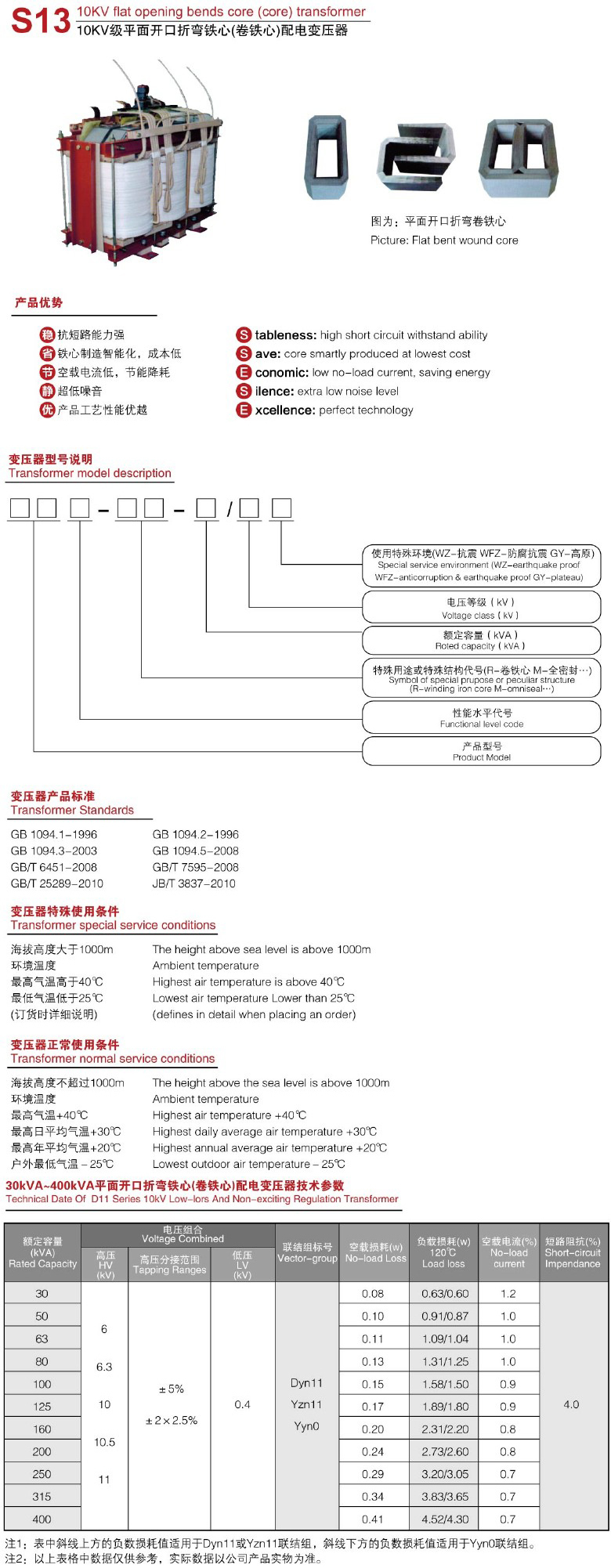 S13-10KV級平面開口折彎鐵心(卷鐵心)配電變壓器